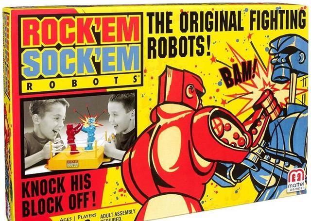 《战斗机器人竞技场》(Rock"em Sock"em Robots)最初诞生于1964年,是一款由两人通过摇杆操控的桌面对战玩具,一个方盒就是一个“竞技场”,玩家分别通过两个摇杆来操控一红一蓝两个机器人的左右手出拳,然后假如一方的力度足够,另一方被击中的头部就会弹起来,以此来分出胜负。这款玩具受到了一定人群的追捧,成为了一款另类经典玩具,时常被很多人回忆,比如《生活大爆炸》中谢耳朵就穿过绘有红蓝机器人对战的T恤。而《铁甲钢拳》的灵感来源之一,其实就是这款玩具。